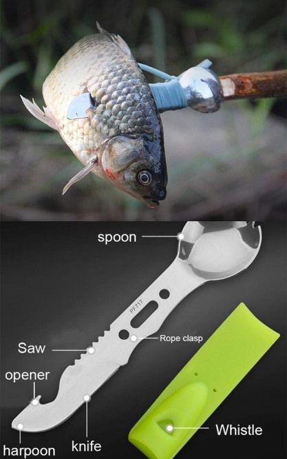 Here is another multitool that can get you unstuck outdoors. The Petrified Fish 8-in-1 Tactical Spork can serve as a knife, bottle opener, saw, harpoon, rope clasp, spoon,, and fork. It weighs 65g and doesn’t take a whole lot of space.