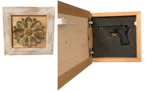 Here is another gun cabinet that lets you store your firearm in plain sight. The Bellewood Designs Distressed Flower Gun Cabinet measures 13 x 13 x 4″. It looks like a piece of art but has room for your weapon. It has a magnetic lock . Its foam insert is customizable.