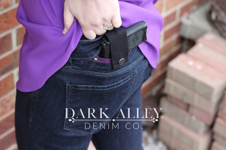 Here is a pair of jeans for women who want to carry their weapon around discreetly. These Ladies Concealed Carry Bootcut Jeans have two ambidextrous pockets for your firearm. They use an elastic strap and heavy-duty snap closure to secure the weapon. The pockets are designed for compact handguns.