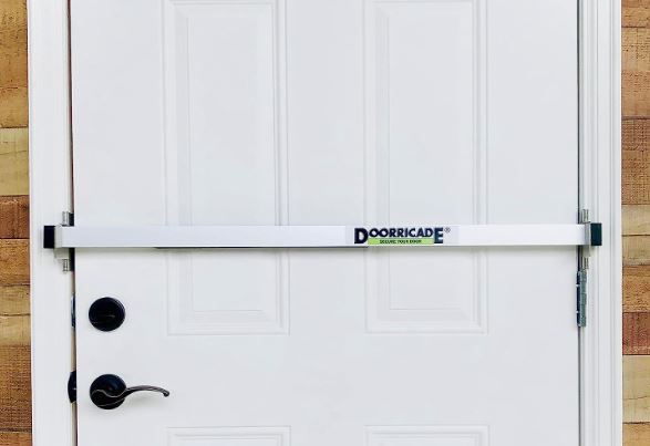 Here is a door barricade lock that lets you stop forced entry in your home. The Doorricade Door Security Bar covers the entire width of your door. It has protective end camps made of aluminum. It is supported by wall studs on both sides of the door.