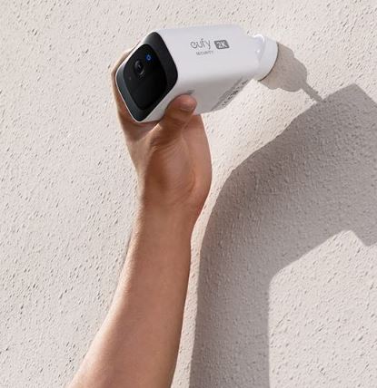 This is the eufy security S220 SoloCam: a compact solar security camera with AI human detection that you can set up outside in 5 minutes. It has 2K resolution and 2.4GHz WiFi connectivity. This camera is IP67 rated, so it can withstand bad weather. It can connect to HomeBase 3 for facial recognition.
