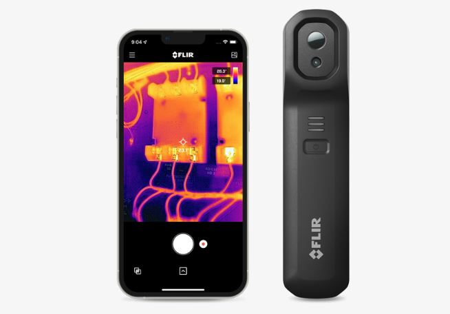 This is the FLIR One Edge Pro: a smart thermal camera that connects to your smartphone wirelessly to let you inspect hard to reach areas. It has a thermal resolution of  160 × 120p. The FLIR One Edge Pro lasts up to 1.5hr on battery. It can measure temperatures up to 400C.
