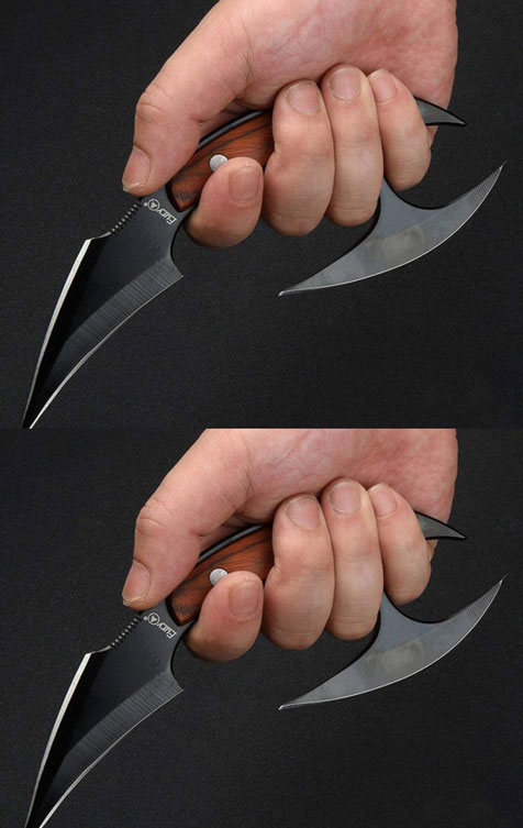 Here is a karambit knife with dual blades that lets you defend yourself and get unstuck outdoors. The Fury 7″ Double Bade Karambit Knife has a stainless steel construction, wood handle, and ergonomic design. It is compact enough to carry in your bag and gives you a strong grip when handling it.