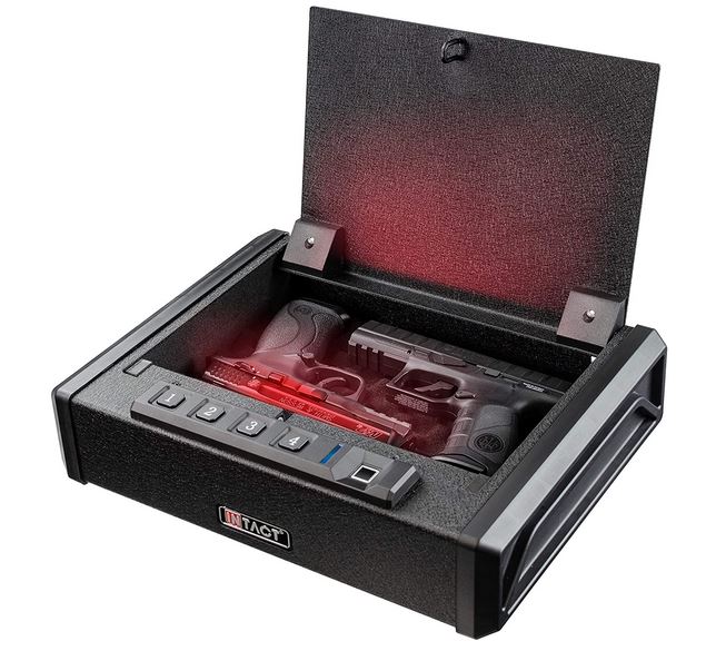 Every gun owner knows the importance of storing their weapon responsibly at home. The Intact XD-900 Biometric Gun Safe can help. It is a quick-access safe with a fingerprint scanner and touch activated 4-digit keypad. It also has a tamper detection alarm.