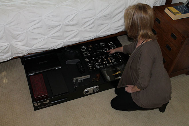 Here is a solid safe that you can fit under your bed to keep your jewelry and other valuable items stored away safely. The Monster Vault Underbed Safe has a steel construction and a slide out drawer with digital programmable combination lock. The safe measures 28″D x 48″W x 7″H, weighing 140 lbs.
