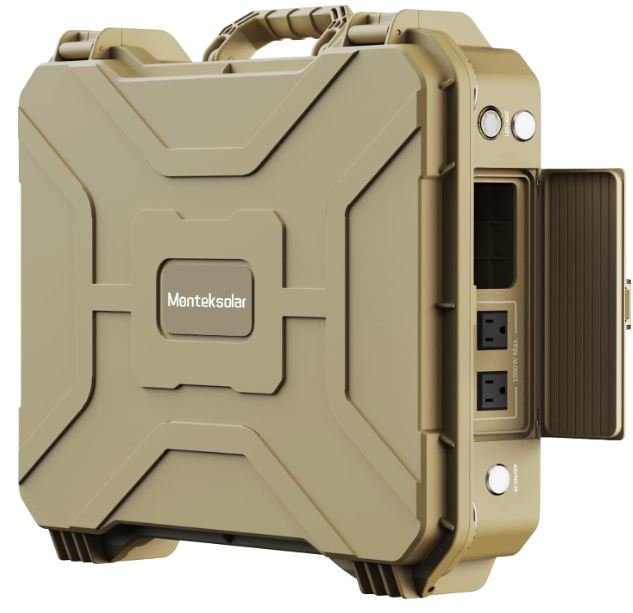 This is the MONTEKSOLAR X1000: a briefcase style portable power station (1000w) that keeps your essential devices going off-the-grid. It is water and shock resistant. It comes with 10 ports, including 2 AC outlets, 1 USB-C, 2QC USB 3.0, and 1 car power output.