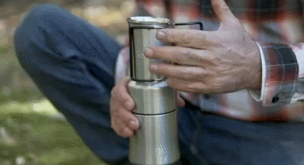 To use this, remove the cup, unfold the handles, add water and coffee grounds, heat the water to boiling, and you are set. You can use this with a variety of stoves.