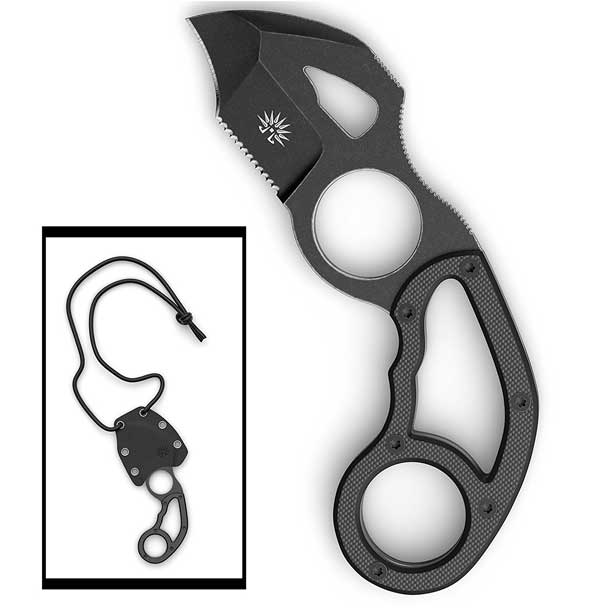 Meet the Off-Grid Tactical Hawkeye Neck Knife: a lightweight, full tang AUS8 steel knife with black oxide coding. Its finger loop and thumb ramp give you a solid grip. You can use its serration to start a fire. The knife can be easily worn around your neck.