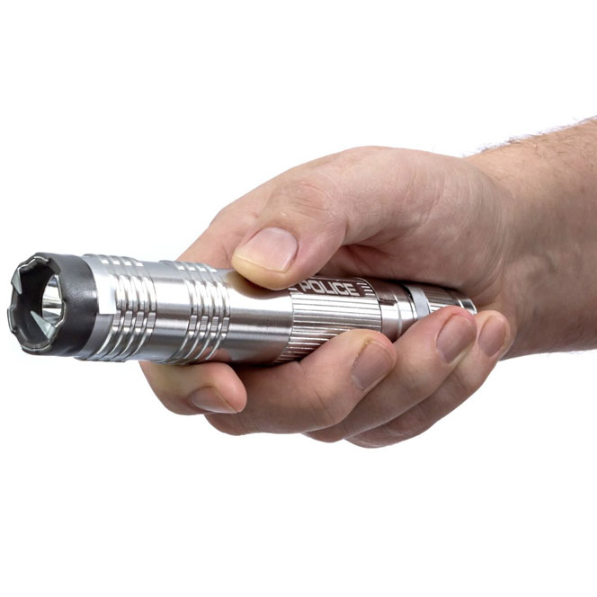 Here is another stun gun that helps you defend yourself. The POLICE M12 is a metal mini stun gun that measures 5.8″ long. It has a 300-lumen LED flashlight too. The stun gun has a safety on/off switch to prevent accidental discharge. The belt clip lets you carry the device around easily.