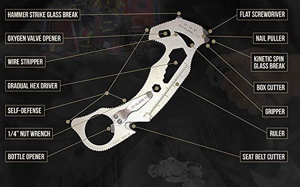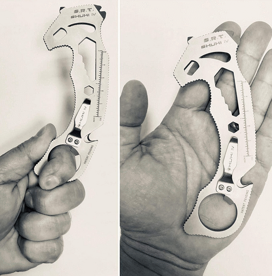 Here is another compact tool that can get you out of trouble. The S.R.T. (Survival Rescue Tool) can be used to cut seat belts, break car windows, and a whole lot more. It has 14 functions, including: