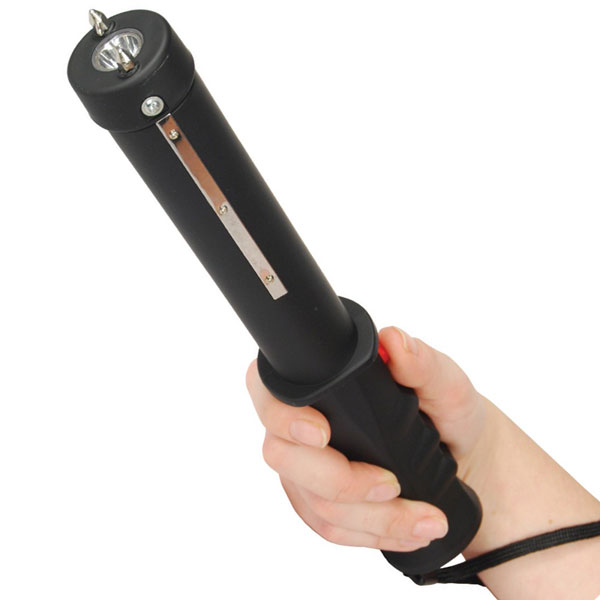 Meet the Safety Technology Stun Gun Baton: a rechargeable device that delivers electricity via top prongs and side strips. It has a safety switch with 3 positions. The LED flashlight has high beam, low beam and strobe. This stun gun baton can deliver up to 12m volts.