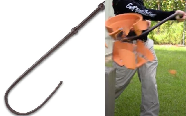 Meet the Night Watchman Sjambok: a leather self-defense whip with a semi-rigid design that you can use to defend yourself against aggressive animals and assailants. It has a knob handle with a wrist strap, so you can keep hold of it. The self defense whip measures 46 inches long.