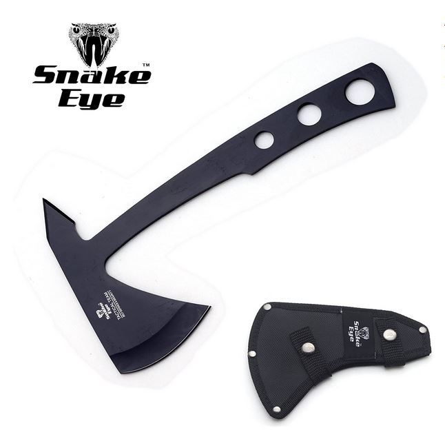 Meet the Snake Eye Tactical Tomahawk: a compact full tang axe that helps you with hunting, hiking, camping, and everything in between. It measures 9.5″ in total with a 5.25″ wide blade. It also comes with a nylon sheath.