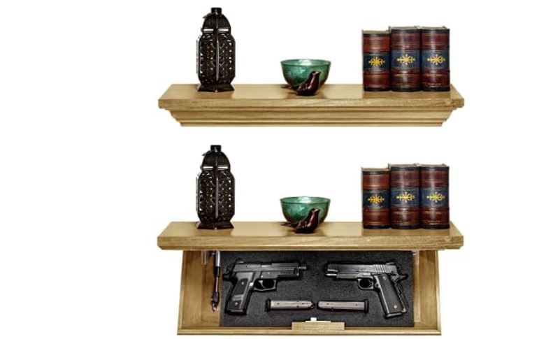Here is another compact firearm shelf that lets you store your gun at home safely and hidden in plain sight. The Tactical Traps Patriot 35S Gun Shelf comes with a RFID locking system and an emergency lockout protection. It has 17 x8 ” interior storage space. You can mount this to any wall in your home in 10 minutes.