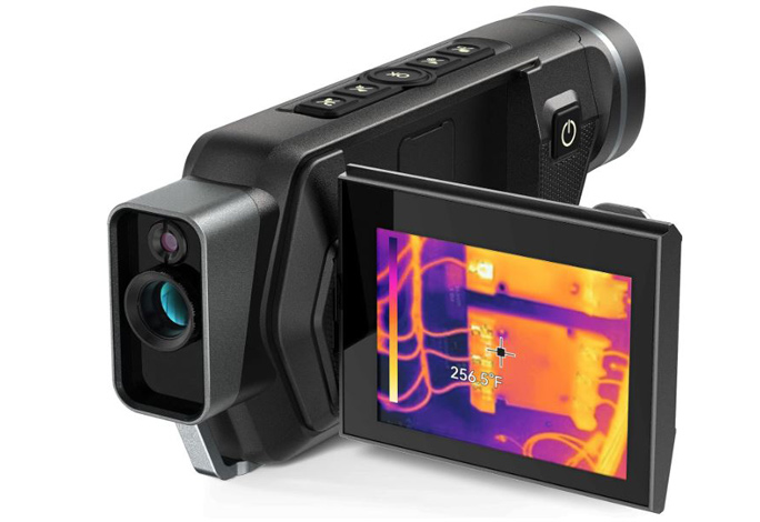 This is the Teslong TTS300: a thermal imaging monocular with a 3.5-inch flip-out LCD screen and electronic viewfinder that you can use to see temperature signatures of things around you in the dark. It has 256x192p thermal resolution with 4X digital zoom and 6 different color palettes.