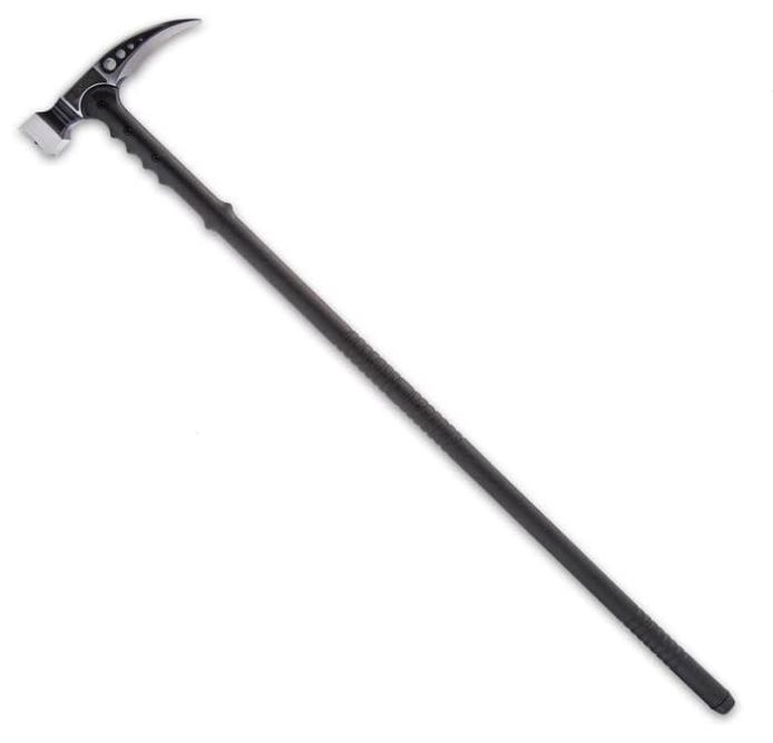 Here is a survival hammer ready for your hiking and camping adventures. The United Cutlery M48 Silver Kommando Hammer measures 37-3/8″ long. It has a fiberglass, reinforced nylon handle. Its head is attached with metal bolts.