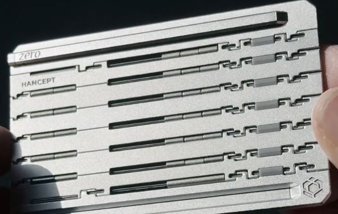 Meet the Zero Mk2: a card sized gadget that transforms into a pen. It has a total of 54 components. It is made with 316L stainless steel, 6000-series aluminum alloy, POM, and N52 neodymium magnets. You can fold and unfold this all you want. The HANCEPT Zero Mk2 turns into a card when you are done writing and fits easily in your pocket.